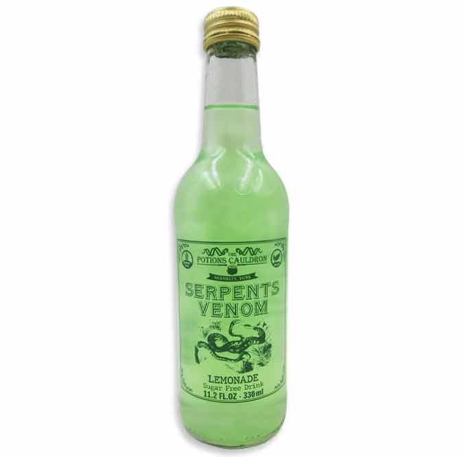 Potions Cauldron Serpents Venom Lemonade soda – VERY RARE!! Imported from the UK, this magical sugar free soda was created by Potions Cauldron and is the craziest soda we’ve seen since Orbitz many years ago!! Pick up the bottle and give it a spin, a couple of shakes and the liquid has what appears to be gold glitter and as the liquid floats in the bottle it has a ghoulish feel to it!! The picture does not do the product justice!! A must have for Halloween or simply collecting.